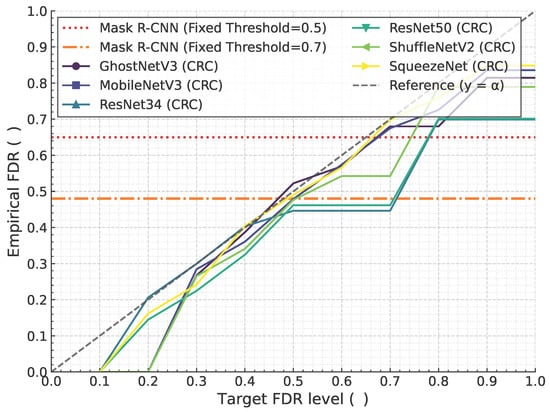 FDR control comparison between CRC-enhanced models and standard Mask R-CNN with fixed thresholds. CRC models successfully keep the empirical FDR below the target level , whereas the non-CRC models have a static, uncontrollable FDR.