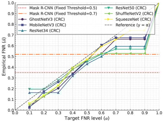 In precision-critical scenarios (Figure 5), if an application demands a target FDR of , the non-CRC models are unsuitable. Our CRC-enhanced models, however, successfully adapt. Similarly, in safety-critical scenarios (Figure 6), CRC provides a vital mechanism for managing recall and ensuring high detection rates by controlling the FNR, a capability entirely missing in the standard model.