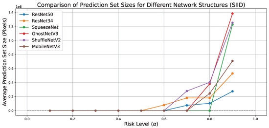 A decoupling can be observed between traditional accuracy metrics and the prediction set size under risk control. For example, with the data set SIID, let us consider a scenario where both ResNet-34 and MobileNetV3 are operating under FDR control targeting and both successfully maintain their empirical . Despite this comparable risk control performance, their operational characteristics can differ: ResNet-34 might yield an average PredSize of 181,279 pixels, while MobileNetV3 might produce a larger PredSize of 245,064 pixels (making ResNet-34’s set 74% the size of MobileNetV3’s). This implies that simply meeting an FDR target does not tell the whole story; PredSize offers additional insight into how “tightly” a model can make its predictions while adhering to the risk constraint. Such differences effectively quantify the varying coverage demands for challenging samples across models. Further analysis reveals a negative correlation () between PredSize and model parameters (complexity/size of the backbone), suggesting that some lightweight designs, while efficient, may achieve risk control by producing larger, less certain prediction sets. This serves as a critical insight for industrial model selection where both statistical guarantees and prediction specificity are important.