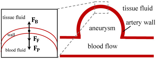 Force analysis of the aneurysm wall. , , and are the force of blood flow, tissue fluid flow, and the resistance of elastin and collagen, respectively.