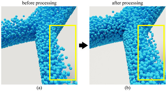 respectively, where is the density of particles, is the flow velocity, t is time, is the gravitational acceleration, ∇ is the divergence, and is the Laplace operator. The three items on the right side of Equation (1) represent the gravity, viscosity force, and pressure acting on particles, respectively. Here, is the dynamic viscosity of the fluid.