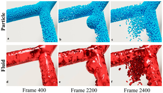 Simulation results of aneurysm growth and rupture. The two rows are particle state rendered online and fluid state rendered offline, respectively. (a,d) show the normal state of an arterial bifurcation at frame 400, (b,e) are the growing state of an aneurysm in the artery at frame 2200, and (c,f) are the rupture state at frame 2400.