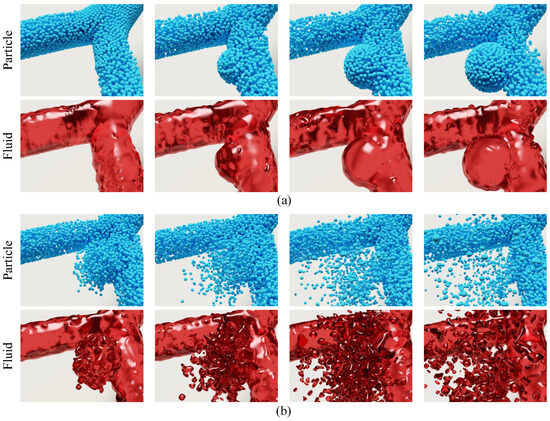The simulation results of aneurysm growth and rupture using the proposed method are shown in Figure 4 (more details about the simulation can be found in the Supplementary Video S1). The figure consists of three columns, which correspond to three different stages of aneurysm progression, i.e., the original state (Frame 400, left), the growing state (Frame 2200, middle), and the rupture state (Frame 2400, right). Each column has two rows of frames that illustrate the particle state (top row) and fluid state (bottom row), respectively. As can been seen from the figure, the proposed method is capable of simulating aneurysm growth and rupture in a visually-realistic fashion. Simulation results demonstrate a high degree of consistency with actual physiological phenomena. For instance, fluctuations in the blood flow impact force reflect the pulsatile nature of blood flow driven by the heartbeat, a key physical driver of aneurysm growth and rupture. Additionally, the reduction in wall thickness h with increasing radius R aligns with the physical characteristics described by Poisson’s ratio, illustrating the material behavior of the arterial wall during expansion. These observations validate the physical accuracy of the simulation. To further demonstrate its efficacy, we provide two additional groups of simulation results in Figure 5. Likewise, the particle and fluid state of the simulation are presented separately in two rows. Each row of a group consists of four frames sampled from the resultant simulation video. We can see from Figure 5a,b that the proposed method is capable of simulating the progressions of aneurysm growth and rupture effectively.