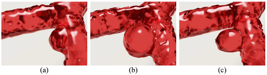 Among existing fluid simulation methods, blood flow simulation is a fluid simulation combined with a blood medical model to generate realistic physiological characteristics of simulated blood. The liquid–solid coupling dynamic simulation of blood and solid substances in the body, such as the interaction between blood and thrombus in thrombosis simulation [11,12], and the interaction between blood and arterial wall in aneurysmal lesion, can restore the real physiological phenomena and pathological process. Our simulation results qualitatively align with clinical observations, such as aneurysm expansion under hemodynamic stress, though future quantitative validation with patient-specific data is planned to enhance clinical applicability.However, due to the complex physiological characteristics of blood and the various liquid–solid coupling behaviors in different scenarios, existing methods do not fully consider the process of vascular blood flow diseases, and cannot simulate the process of specific disease through graphics fluid simulation technology effectively and efficiently. Combining blood characteristics with the physical characteristics of blood vessels, these liquid–solid coupling simulations based on fluid simulation methods (e.g., smoothed particle hydrodynamics (SPH)) can help clinical medical analysis and the prediction and diagnosis of various types of vascular diseases [13,14]. In this paper, we also use SPH to simulate blood flow dynamics in light of its great advantages [15] in complexity and computational efficiency, and introduce a novel method for the simulation of aneurysm formation, growth, and rupture.