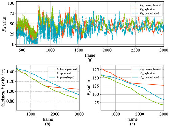 Figure 7 illustrates the hydrodynamic parameter changes of different aneurysm shapes from frame 400 to frame 3000. From the changes in the pressure on the aneurysm wall (Figure 7a) and those of the wall thickness of the aneurysm (Figure 7b), it can be seen that the fluctuations in the impact force of the blood flow in the aneurysm of different shapes are similar, and the change in thickness is related to the shapes of the aneurysms. In addition, the thickness changes of the hemispherical and spherical aneurysms are small, and the thickness of pear-shaped aneurysms tends to decrease relatively slowly, which is related to the growth rate of the aneurysms. Equation (16) reflects this phenomenon. In Figure 7b, the thickness change of the hemispherical aneurysm tends to change to 0 from about 1600 frames of the simulation. This is because the maximum size of the aneurysm can be set artificially in the implementation, while at this time, the hemispherical aneurysm has reached a fully developed state. Since the threshold of aneurysm rupture is related to the wall thickness and size of the aneurysm, we tracked the rupture pressure threshold of aneurysms of different shapes, as shown in Figure 7c. Before the aneurysm is fully developed, the pressure thresholds of spherical and hemispherical aneurysm ruptures are similar in magnitude, while that of piriform aneurysms is relatively small, and this is consistent with the relevant numerical analysis results summarized in the literature [40].