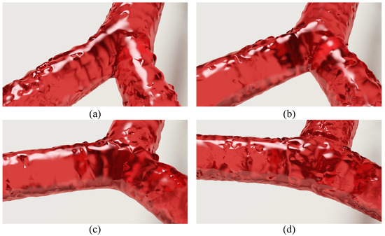 Simulation results under different bifurcation angles. The angles set in (a–d) are , , , and , respectively.