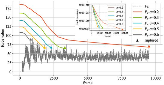 Effects of different values on changes in aneurysm wall thickness and rupture threshold. is the impact force calculated by Equation (16) in Section 3.2. The triangular symbol represents the number of frames and the corresponding wall thickness and impact force when the aneurysm ruptures under the condition of corresponding values.