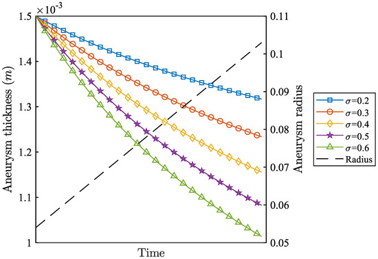 where and are the thickness of the aneurysm wall and the radius of the aneurysm at time t, respectively, and is the Poisson ratio.