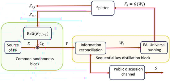 In the splitter block, from the distilled key , the key is selected to refresh the secret key of , resulting in the updated , while the remaining part, , is reserved for subsequent use. From the system’s end-use perspective, the generation rate of usable secret keys is equal to the generation rate of .