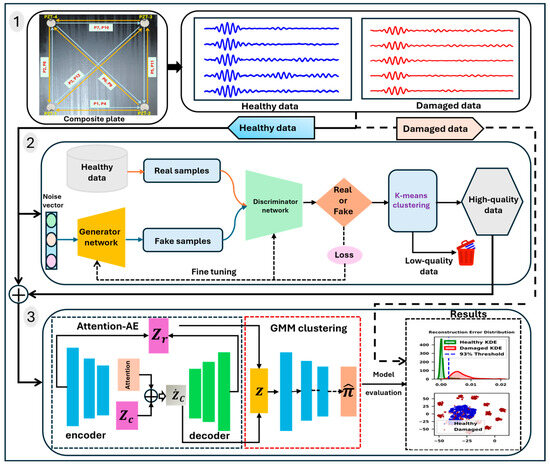 The proposed framework comprises of three main components: (1) an experimental setup and data acquisition, (2) a GAN for generating synthetic data, and (3) a self-attention autoencoder (SAE) with a Gaussian Mixture Model (GMM) for anomaly detection. Figure 1 shows the architecture of the SAE-GMM framework. First, a composite plate was fabricated, and Lamb wave-based experiments were conducted to collect both healthy and damaged signals. The GAN model was employed to generate synthetic healthy data that closely resembled the original healthy signals. To ensure data quality, the K-means algorithm was applied to filter out the most realistic synthetic samples before incorporating them into the dataset for augmentation. The autoencoder was trained exclusively on healthy data using a self-attention module integrated into the encoder to enhance feature extraction. The reconstruction error and latent vector were then combined to form a new input vector for density estimation using the GMM, enabling effective anomaly detection.