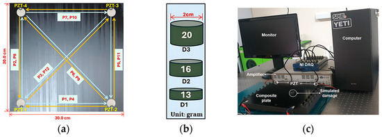 The configuration consisting of four piezoelectric transducers, each with the dual functions of actuation and sensing, attached to a laminated plate is presented in Figure 2a. Twelve sensing paths (P1–P12) were used for data acquisition. The composite plate was segmented into nine grid zones, each measuring 90 mm × 90 mm. To simulate varying damage severity levels, as presented in Figure 2b, three distinct masses (13 g, 16 g, and 20 g) were simultaneously placed at the center of each grid zone. A disk magnet was chosen to simulate the damage because it was non-destructive, easy to position, and capable of altering the local stiffness and acoustic impedance of the laminate, thereby affecting the propagation of Lamb waves. This approach also allowed for a reversible process that enabled the collection of both healthy and damaged data under controlled conditions. The experimental setup, as shown in Figure 2c, comprised an NI-USB 6341 series data acquisition system, a dual-channel PZT amplifier, and a LabVIEW-controlled PC for signal generation and data acquisition.