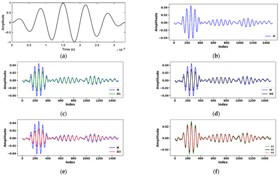 Measured Lamb wave signals along path 3: (a) excitation signal; (b) response under healthy conditions; (c) comparison between healthy and damaged case D1; (d) comparison between healthy and damaged case D2; (e) comparison between healthy and damaged case D3; (f) comparison of all damage cases (D1–D3).