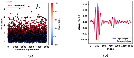 Specifically, the root mean square (RMS) of each generated signal was compared with that of the original healthy signal. A threshold was established based on the minimum distance between the centroids of two clusters. Synthetic signals with mean squared error (MSE) values below this threshold were classified as high-quality, as shown in Figure 4a. A representative comparison between a generated signal and an original healthy signal is shown in Figure 4b, demonstrating a close resemblance in both amplitude and temporal structure, with only minor deviations observed in the second-wave packet. In total, 3270 high-quality synthetic signals were generated and combined with the original healthy data, yielding a final dataset comprising 3870 samples.