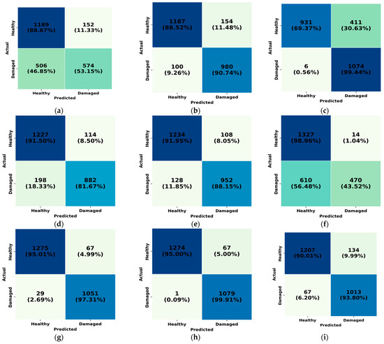 To train the proposed and baseline models, 5-fold cross-validation was employed to split the healthy data into training and validation sets. For each damage category, 35% of the corresponding data were randomly selected to minimize imbalances during the testing phase. The selected samples from the three damage severities were concatenated to construct the damage dataset. Subsequently, the damaged dataset was combined with validation healthy dataset to form the testing dataset.