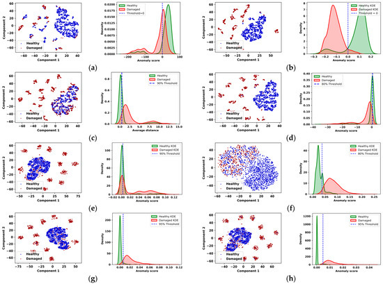 t-SNE visualizations and KDE plots: (a) Oc-SVM; (b) IsoForest; (c) KNN; (d) LOF; (e) IRAD; (f) Deep-SVDD; (g) VAE; (h) SAE-GMM.