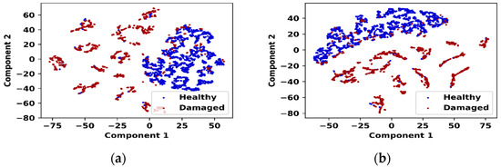 To highlight the impact of the attention mechanism on the proposed model, the feature distributions before and after applying attention are shown in Figure 7. Figure 7a shows the t-SNE plot of the features before the implementation of the attention mechanism, where a significant overlap between healthy and damaged samples is observed, indicating a poor class distribution. By contrast, Figure 7b shows the feature distribution after applying attention, demonstrating an improved separation between the two classes with a distinct gap. This indicates that the attention mechanism effectively enhances the feature representation for the proposed SAE-GMM model, resulting in better class separation compared to other models that do not utilize attention.