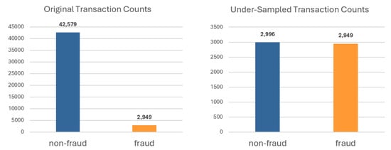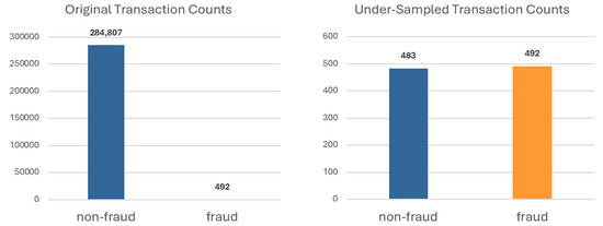 17]. In this study, we employed random under-sampling techniques on both datasets to mitigate the prevalence of non-fraud samples, with the objective of achieving a nearly equal distribution between fraud and non-fraud classes, each constituting approximately 50%. Utilizing the random under-sampling approach, the European credit cardholders dataset was adjusted to contain 483 non-fraud transactions and 492 fraud transactions (see