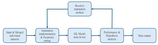 Initially, the two datasets intended for merging are input. Next, the chosen imputation method is applied to fill in the missing values in the merged dataset, resulting in a complete dataset without any gaps. Following this, model training and prediction are conducted, with the predicted results analyzed through performance evaluation and hypothesis testing. Finally, if the analysis indicates that the performance of the merged dataset is similar to or significantly improved compared to the original dataset, the results and model will be output. Otherwise, the imputation method will be reselected, and relevant parameters will be adjusted to retrain the model.