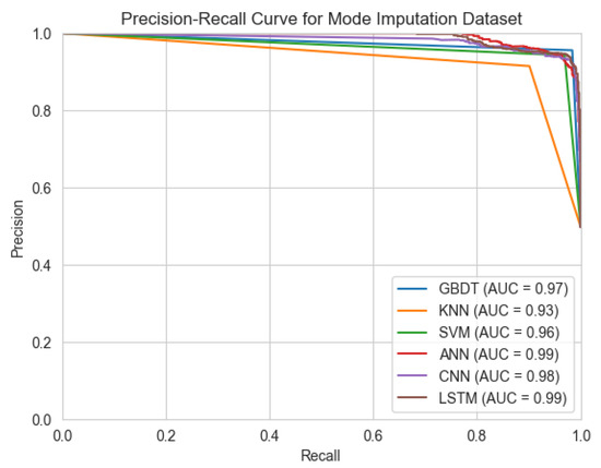 Regarding PR-AUC, the assessed models (e.g., GBDT, SVM, CNN, and LSTM) consistently demonstrated robust performance, with values spanning from 0.96 to 0.99 (as depicted in