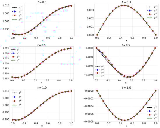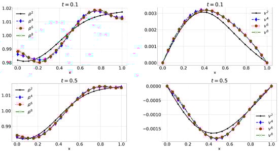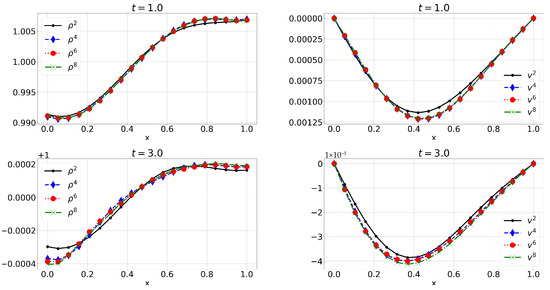 E2: Numerical approximations of mass density and velocity v for .