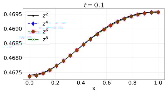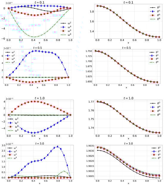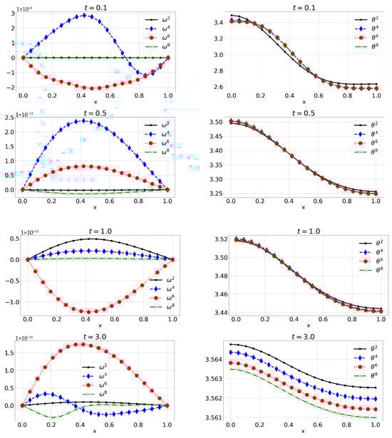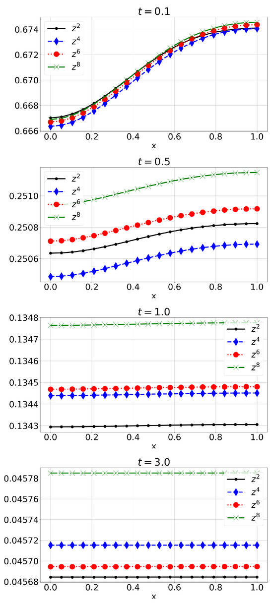 Figure 1, Figure 2 and Figure 3 show numerical approximations , , , , and for mass density, velocity, microrotation, absolute temperature, and the mass fraction of unburned fuel, respectively, for at times . The results show that mass density, absolute temperature, and the mass fraction remain non-negative over time, with the fuel proportion decreasing progressively. This behavior is consistent with the model’s physical interpretation. It is also evident that both velocity and microrotation decay relatively rapidly to zero. This last observation aligns with results from [16,19], where the long-term behavior of solutions for a spherically symmetric ideal micropolar gas and a one-dimensional reactive real micropolar gas was analyzed. Specifically, we expect similar asymptotic behavior in this model, namely that for larger times, v, , and z decay to zero, while and stabilize around constant values. This behavior is clearly visible in the present example, providing experimental confirmation of the validity of both the model and the numerical scheme. However, a rigorous proof of these properties for the current model remains open, and we plan to address this in future work. It should also be noted that for increasing yet even relatively small values of n, the approximations are already quite close, which indicates that the method converges to a solution quickly. This is consistent with Theorem 1, which analytically established that the semi-discretized scheme is convergent (at least on a subsequence). The rapid convergence can be attributed to the simple initial conditions, which have a finite Fourier expansion; consequently, the approximations of the initial data are exact. The largest deviations are observed for in Figure 2, but these can be attributed to rounding errors due to a very small scale on the order of or smaller.