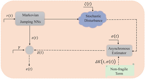 in which and refer to a foregone real matrix. stands for an unaware matrix subject to . The corresponding framework of the Markovian jumping NNs and asynchronous estimator is demonstrated in Figure 1. In addition, can also be a Markov process. Meanwhile, it takes useful value in another set . In addition, for , denotes transition rate matrix, and set transition probability as