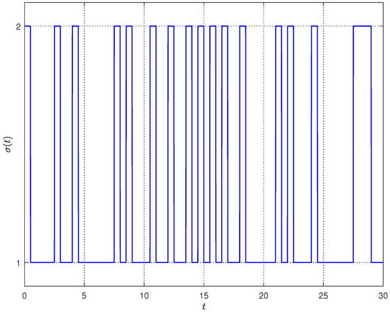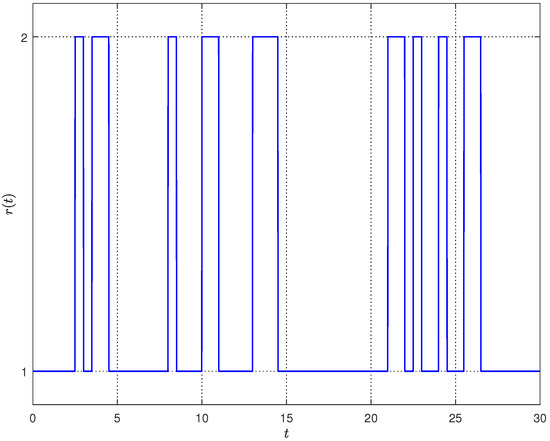 The two involved Markov processes and with initial modes and all follow exponential distribution. Meanwhile, their trajectories are shown in Figure 2 and Figure 3, respectively. Furthermore, relevant transition rate matrices can be set as