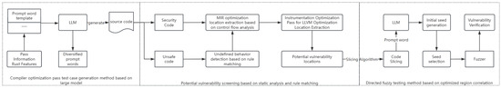 In the modern software development process, testing is the core means to maintain software quality. As a key basic software, the test input of the compiler is usually a source code written in the target language. The core goal of compiler optimization vulnerability detection is to discover unexpected behaviors generated after the program is compiled when the user enables a specific combination of optimization options. However, the current test is basically based on a semantically generated random code, which makes it difficult to cover the optimization pass in a targeted manner, resulting in severe challenges in optimization vulnerability detection and verification. Existing compiler test program generation methods are mainly divided into three categories: specification-based methods (such as Csmith [9], RustSmith [10], and YARPGen [11]) randomly generate a code through grammatical semantic rules; machine learning-based methods (such as DeepSmith [12], DeepFuzz [13], and DSmith [14]) use deep learning technology to analyze code features to generate programs; and mutation-based methods (such as Orion [15], Athena [16], and Hermes [17]) generate equivalent variants by modifying existing test programs. While these methods improve test coverage, they still have problems such as low correlation between a generated code and optimization pass and insufficient semantic perception.