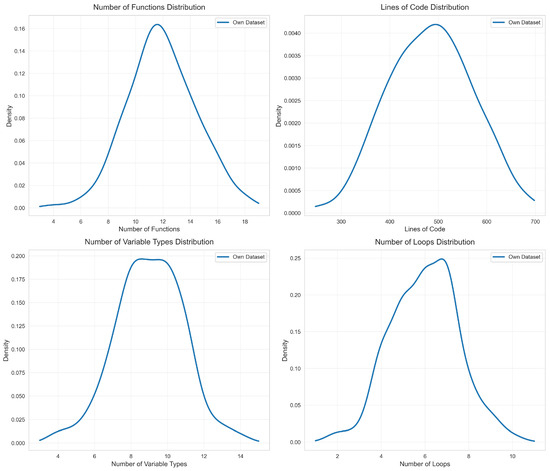 First, to verify that our own dataset has statistical significance, this paper conducts statistical analyses on our own dataset from four dimensions: Number of Functions, Lines of Code, Number of Variable Types, and Number of Loops. The final experimental results are shown in Figure 5. It can be seen that, starting with the Number of Functions, the distribution of this feature in the generated test files presents a certain degree of concentration and dispersion. For Number of Functions, one-way ANOVA (p < 0.05) reveals significant variability among samples, indicating inherent diversity in functional complexity. For Lines of Code, ANOVA (p < 0.05) confirms significant differences in code scale, consistent with real-world programming diversity. Regarding Number of Variable Types, ANOVA (p < 0.05) shows notable variation in variable type usage, reflecting meaningful data handling complexity. For Number of Loops, ANOVA (p < 0.05) indicates significant differences in loop frequency, aligning with practical control flow variations. Overall, significant ANOVA results across all dimensions confirm the dataset’s statistically meaningful variability, validating its representativeness for subsequent experiments.