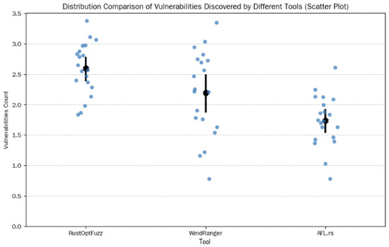 Distribution comparison of vulnerabilities discovered by different tools (scatter plot).