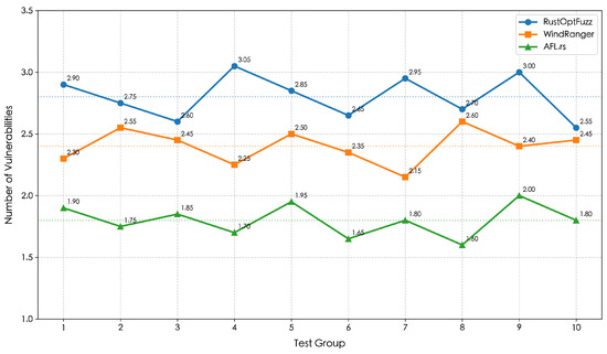 To verify the stability of the method proposed in this paper, the above 200 test files were randomly divided into 10 groups, and the vulnerability detection capabilities of three tools (RustOptFuzz, WindRanger, and AFL.rs) were evaluated, respectively. The final experimental results are shown in Figure 7. It can be observed that RustOptFuzz consistently outperforms the other two tools across all 10 test groups, with its average number of detected vulnerabilities per group ranging from 2.55 to 3.05, maintaining a clear lead. WindRanger demonstrates a moderate performance, with its per-group averages fluctuating between 2.15 and 2.6, which is stably lower than RustOptFuzz but significantly higher than AFL.rs. AFL. rs shows the lowest vulnerability detection capability among the three, with per-group averages varying from 1.6 to 2.0, forming a distinct gradient with the other two tools.