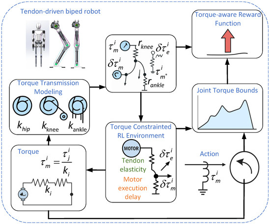 In recent years, reinforcement learning (RL) has achieved remarkable success in high-dynamic motion-control tasks for robots, particularly demonstrating excellent policy-optimization capabilities in complex actions such as bipedal walking, running, and jumping [1,2]. However, despite their strong performance in simulation environments, these methods still face significant challenges when deployed on real hardware [3,4]. The core issue lies in the persistent “sim-to-real” gap, which manifests primarily in two aspects. First, the physical limitations of real-world actuators, including peak torque and instantaneous power constraints, are frequently oversimplified or neglected during training. Many RL-based approaches still rely on static and uniform torque limits, failing to account for the speed-dependent characteristics of power, thereby increasing the risk of motor overload or failure during actual execution [3,5]. Second, complex nonlinear features such as tendon-driven transmission, joint coupling, and elastic deformations are rarely modeled explicitly, resulting in control policies that fail to generalize to real-world systems [6,7].