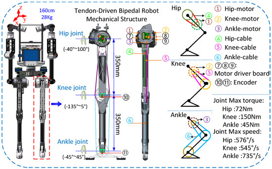 The bipedal robot platform used is illustrated in Figure 2. The robot stands 1.6 m tall, weighs approximately 28 kg, and has a total of 28 degrees of freedom (DOFs), 10 of which are allocated to the legs. Each leg has 5 DOFs, including 3 at the hip (pitch, abduction/adduction, and rotation), 1 at the knee (pitch), and 1 at the ankle (pitch). To enhance mobility and significantly reduce the load and inertia of distal limbs, tendon-driven mechanisms are employed at the robot’s key joints. This actuation method offers distinct advantages, including lightweight transmission, superior force control, and fast dynamic response. Owing to these features, tendon-driven mechanisms have been widely applied in robotics and bio-inspired manipulators. In scenarios where low mass, high compliance, and a high torque-to-weight ratio are essential, a tendon-driven mechanism enables agile, safe, and efficient motion control [20,21]. High-torque DC motors combined with tendon-driven systems are centrally mounted near the center of mass (COM) on both sides, and their output is transmitted to the knee and ankle joints via lightweight high-strength cables. This design reduces the structural mass of a single leg to below 3.6 kg.