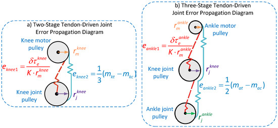 The joint position error in a hybrid tendon-driven mechanism mainly consists of two components: the motor execution error and the elastic deformation error of the tendon. As shown in Figure 3, the error of the knee joint, denoted by , can be expressed as: