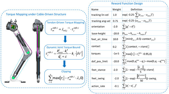 To achieve efficient autonomous control of bipedal robot jumping, this study builds a RL training environment based on the isaacgym platform and proposes a physics-consistent control framework that explicitly incorporates torque boundaries and tendon-driven coupling constraints [27]. Compared to conventional policy-optimization methods that focus solely on trajectory performance, this work systematically integrates two key factors—actuator safety and structural coupling characteristics—into the reward function design, as shown in Figure 4.
