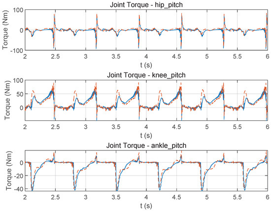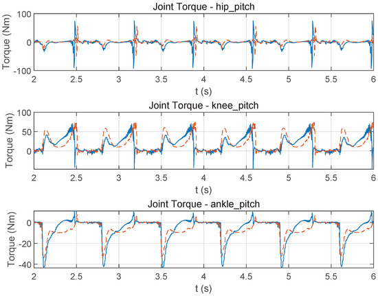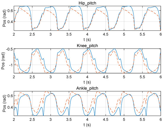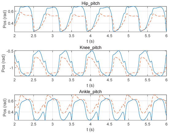 Comparison of joint motion trajectories. This figure shows the joint motion trajectories of the hip, knee, and ankle joints under two control methods. It can be seen that the joint trajectories controlled by torque errors and the motor–joint coupling relationship are smoother, indicating higher coordination and stability. This verifies that the strategy of incorporating coupling modeling and torque errors helps improve multi-joint coordination control and jumping stability.