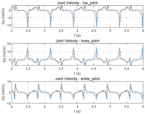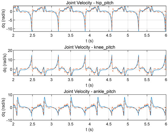 Comparison of joint velocity. This figure shows the joint velocities (dq) of the hip, knee, and ankle joints over time under two control methods. The comparison shows that the joint velocities controlled with torque errors and coupling modeling are slightly higher, indicating a higher speed response during the control process.