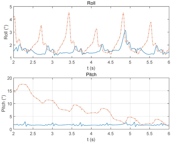 Comparison of roll and pitch angles during jumping. The proposed method results in smaller posture deviations, confirming better stabilization and enhanced resistance to disturbances.