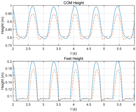Comparison of robot COM height and feet height. This figure shows the changes in the robot’s COM height and feet height over time under two control methods. The comparison demonstrates that incorporating coupling modeling and torque error-compensation results in higher COM peaks and more consistent foot clearance, confirming enhanced jumping power and improved motion repeatability.
