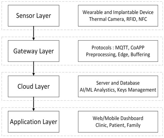 The IoMT architecture consists of four main layers—sensor, gateway, cloud, and application—that collectively ensure seamless medical data acquisition, processing, and clinical information delivery [13,14,15]. At the sensor layer, implantable devices (e.g., pacemakers and insulin pumps) and wearables (e.g., smartwatches and ECG patches) continuously capture vital patient metrics with minimal power consumption [16]. Environmental sensors, such as thermal cameras, Radio-Frequency Identification (RFID) readers, and Near-Field Communication (NFC) tags, augment these measurements by providing contextual data for more informed clinical decision-making [13]. At the gateway layer, sensor outputs are aggregated and transmitted via lightweight protocols like Message Queuing Telemetry Transport (MQTT) and the Constrained Application Protocol (CoAP). This layer performs essential preprocessing tasks, including data filtering, anonymization, and temporary buffering before securely forwarding selected data to the cloud over cellular networks or virtual private network (VPN) links, thereby reducing latency and offloading computation from end devices [14].