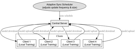 Figure 2 depicts the FL workflow with adaptive synchronization, where the central server manages local training on each client, gathers encrypted model weights, and regularly shares the global model. The adaptive synchronization scheduler adjusts the frequency and size of updates based on the resource profiles and network conditions of the clients.