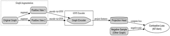 First, for contrastive loss, two augmented versions of the same graph are generated to sharpen the model′s ability to distinguish between similar and different graphs. This loss encourages the projections and from the same views to become closer in the contrastive space while ensuring that the projections from other graphs (negative) remain separate. The exponential ratio and SoftMax normalization impose a greater penalty when different graphs are in close proximity, as described in Equation (5):