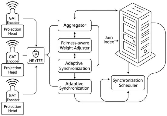 The heterogeneous distribution of data across clients can undermine the stability and accuracy of the global model. To mitigate this, FedGCL incorporates a fairness-aware aggregation mechanism that dynamically weights each client’s contribution according to both data quality and available computational resources, ensuring no subset of clients disproportionately influences model updates [22,23]. Concurrently, the central coordinator monitors per-client metrics, such as local training efficacy, data throughput, and processing latency, and adaptively adjusts synchronization schedules to align with each client’s capabilities. Empirical evaluation on an IoMT dataset demonstrates that this adaptive strategy reduces the number of communication rounds by up to 45%, lowers average latency by 30%, and yields a 30% improvement in malware detection accuracy relative to standard FedAvg.