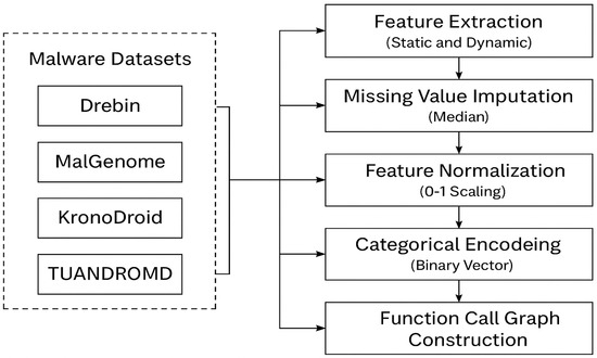 During this stage, malware samples were collected from four publicly available datasets—Drebin [31], MalGenome [32], KronoDroid [33], and TUANDROMD [34]—which were combined to form a comprehensive sample set. In terms of dataset diversity, the four benchmark malware datasets—Drebin (5560 samples, 179 classes), MalGenome (1260 samples, 49 families), KronoDroid (6937 samples, 24 families), and TUANDROMD (8700 samples, 10 families)—cover a wide range of malware types and categories, making sure our evaluation represents the variety usually found in real-world IoMT environments. Each malware file was analyzed to extract both static and dynamic features. Static features included application permissions and API calls, while dynamic features were derived from system call traces generated during execution. To handle data inconsistencies, missing values were imputed using the median statistics, and outliers were detected and removed using the interquartile range (IQR) method. All numerical features were normalized to the range [0,1], and categorical variables were encoded using binary vectors to ensure uniformity in scale and representation. Finally, each sample was transformed into a function call graph, where nodes represent individual functions and edges denote call relationships between them. The resulting structured dataset was formatted to support training with GNNs, ensuring compatibility with the Fed-MalGAT model architecture.