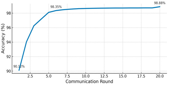 Additionally, Figure 10 provides a dual-axis graph, plotting loss (left axis) and accuracy (right axis) against communication rounds. During the rapid adaptation phase (rounds 1–5), the global loss decreases by more than 0.05 per round, from approximately 1.54 to 1.40, while accuracy increases sharply by 2–4% per round, reaching ~98% by the fifth round. In the subsequent steady phase (rounds 6–10), the rate of improvement slows significantly, with loss decreasing by less than 0.01 per round and accuracy increasing by less than 0.1% per round, suggesting that the model has nearly converged to its optimal performance on the dataset.