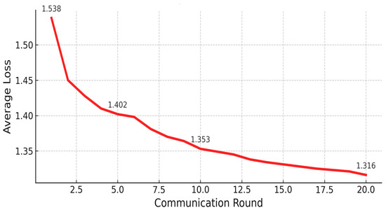In Figure 7, the evolution of the average global loss per communication round is illustrated, showing how quickly the Federated Contrastive Learning mechanism aims to reduce prediction errors from iteration to iteration. This indicates a decrease in global loss values from the first to the last round. The average loss value started at 1.538 in the first round and then dropped drastically to 1.450 in the second round and 1.428 in the third round. This indicates that the aggregation at the beginning of client updates quickly corrects the model weights. The decline continued to 1.402 in the fifth round and 1.370 in the eighth round before entering the convergence phase, where each round only reduces the loss by about 0.10 to 0.02. In the twentieth round, the loss value reached 1.316, confirming that after several high-intensity iterations, model optimization began to slow down but continued to show marginal improvements until the end of the training. In this pattern, it is consistent with the improvement in accuracy shown in Figure 6, while the reduction in loss becomes smaller over time, reflecting the model′s good performance.