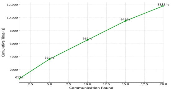 Figure 8 shows the total accumulated training time required by FedGCL to reach convergence. After the first round, the training time reached 612 s and continued to increase progressively with each subsequent round. By the fifth round, the accumulation reached 2927 s, and by the tenth round, it nearly reached 5900 s. Although each round required a relatively consistent computation time of around 580 to 613 s, the cumulative curve began to plateau slightly by the fifteenth round and stabilized at 11,235 s by the twentieth round. This trend indicates that while the model continues learning throughout all rounds, its computational efficiency improves over time, as evidenced by the slight decrease in time required per round toward the end of training. This behavior highlights a key advantage of the proposed approach: the ability to reduce computational overhead during the federated learning process while maintaining effective model convergence.