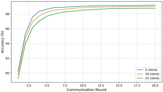 Figure 9 presents a comparison of the accuracy evolution in FedGCL across three client configurations: 5, 10, and 15 clients. The results show that, generally, increasing the number of clients leads to a slight delay in reaching specific accuracy thresholds. For instance, with five clients, the model achieved 96% global accuracy by the third round and surpassed 98% by the fifth round. In contrast, with 10 clients, these thresholds were reached at the fourth and fifth rounds, respectively, and with 15 clients, they were attained at the fourth and seventh rounds. However, by the twentieth round, all configurations converged to nearly the same peak accuracy of approximately 98.9%, indicating that FedGCL maintains strong performance and stability regardless of the number of participating clients. This demonstrates the framework’s robustness and its ability to achieve high accuracy even under varying levels of system heterogeneity and communication load.