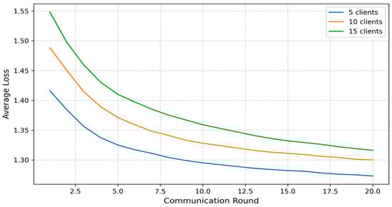 Figure 10 presents a comparison of the global average loss across the three client configurations (5, 10, and 15 clients), illustrating how quickly the model reduces prediction errors over successive communication rounds. For the five-client setup, the loss decreased most rapidly, starting at approximately 1.42 in the first round and dropping to 1.27 by the twentieth round. In the 10-client scenario, the initial loss was slightly higher at 1.49, decreasing to 1.30, while the 15-client configuration began with a loss of 1.55, eventually reaching 1.32. Although larger client populations result in a slower decline in loss—consistent with the observed accuracy convergence trend—all three setups converge to similar loss values by the end of training. This outcome demonstrates that FedGCL remains stable and effective in model optimization, even under increased data heterogeneity and communication overhead, reinforcing its suitability for diverse IoMT environments.