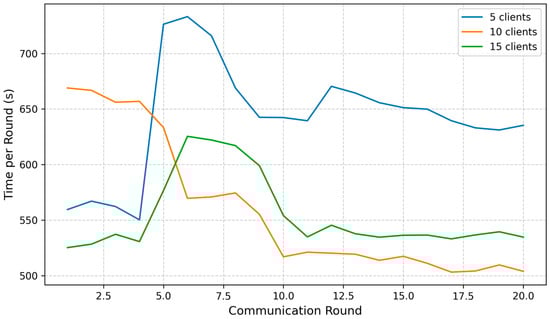 Figure 11 illustrates that while the computational load per round increases with the number of clients, the rise is relatively modest. With five clients, the average time per communication round ranges from 550 to 830 s. When scaling to 10 clients, the per-round time increases slightly to 580–610 s, and for 15 clients, it reaches approximately 600–630 s per round. Notably, despite tripling the number of clients, the increase in computation time per round remains within a narrow range—representing only about a 10–15% increase overall. This demonstrates that FedGCL maintains stable performance and efficient convergence, even as system scale increases, making it well-suited for practical deployment in resource-constrained IoMT environments.